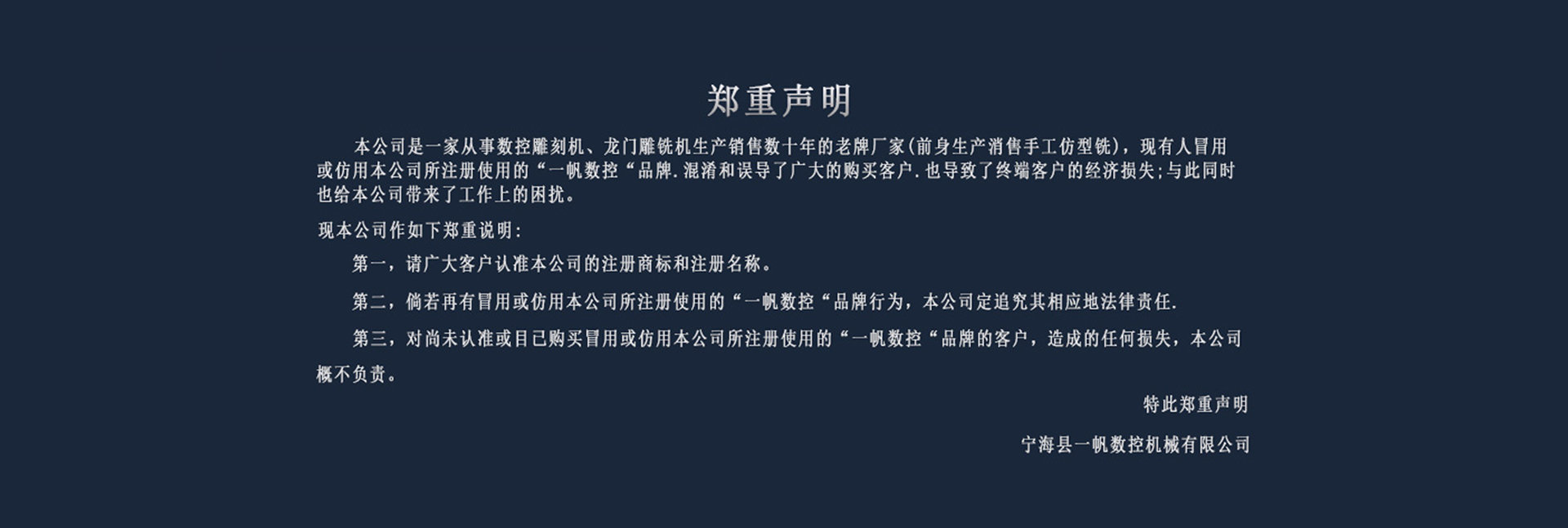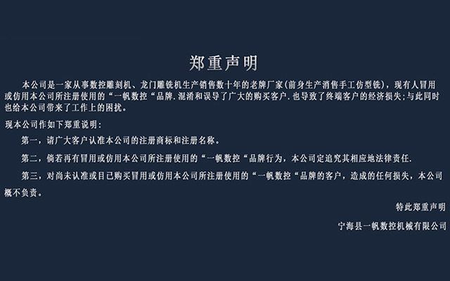寧海縣一帆數(shù)控機(jī)械有限公司座落在有“中國(guó)模具生產(chǎn)基地”美稱(chēng)的浙江省寧波市寧??h,是一家擁有40多年生產(chǎn)銷(xiāo)售經(jīng)驗(yàn),并能自主研發(fā)、設(shè)計(jì)、制造各種數(shù)控機(jī)械設(shè)備的專(zhuān)業(yè)廠(chǎng)家。在現(xiàn)有的基礎(chǔ)上,本公司研發(fā)了數(shù)控雕銑機(jī)、高速龍門(mén)銑、高速雕銑機(jī)、高精密雕銑機(jī)、數(shù)控加工中心及木工雕刻機(jī)等產(chǎn)品,采用國(guó)內(nèi)先進(jìn)技術(shù)和精密零部件,研發(fā)生產(chǎn)了YF-D2516、YF-D2016、YF-D1615、YF-D1512、YF-D1311、YF-D1190、YF-D870、YF-D660、YF-D650、YF-C850(CNC加工中心)、YF-G660(龍門(mén)高速銑)、YF-M260150(數(shù)控木工機(jī))等一系列型號(hào)。與此同時(shí),還可根據(jù)客戶(hù)的不同需求定制各種尺寸的數(shù)控機(jī)械設(shè)備。